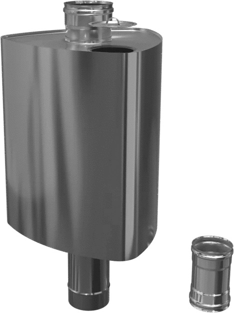 Конструкция бака состоит из стального корпуса, который закреплён на трубе-дымоходе. Труба, обечайка и нижняя стенка корпуса бака выполнены из стали AISI 201 толщиной 1,0 мм, которая обладает высокой коррозионной стойкостью и отлично взаимодействует с водой. На нижней стенке корпуса расположен сливной штуцер с наружной трубной резьбой 1/2 дюйма. Верхняя стенка корпуса выполнена из стали AISI 430 толщиной 0,8 мм, на ней расположено заливное отверстие, которое закрывается крышкой. Проверенный честный объём бака. Установка бака производится "по конденсату". Нижняя часть трубы бака теперь разъемная. Адаптер М-М 235 мм в комплекте!
