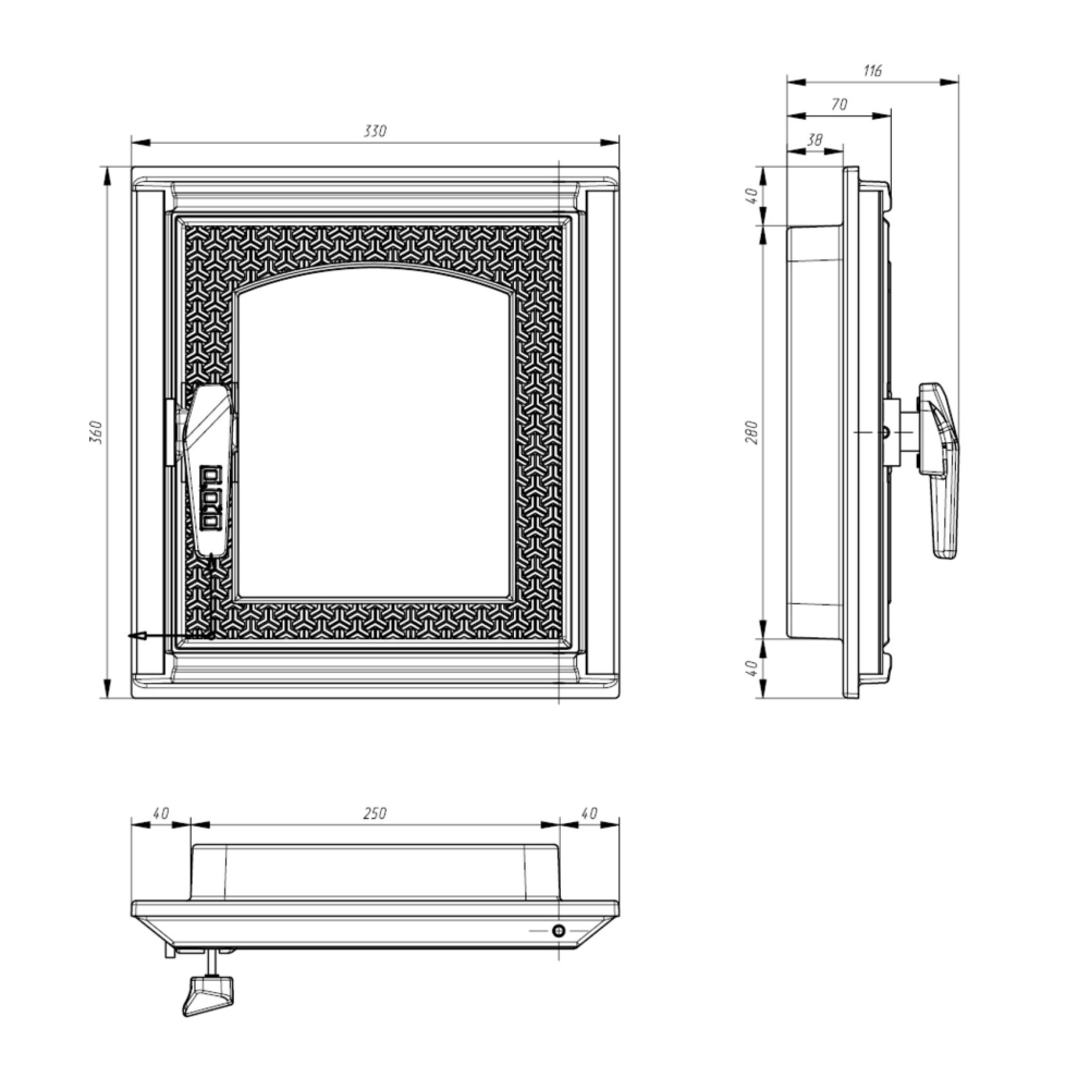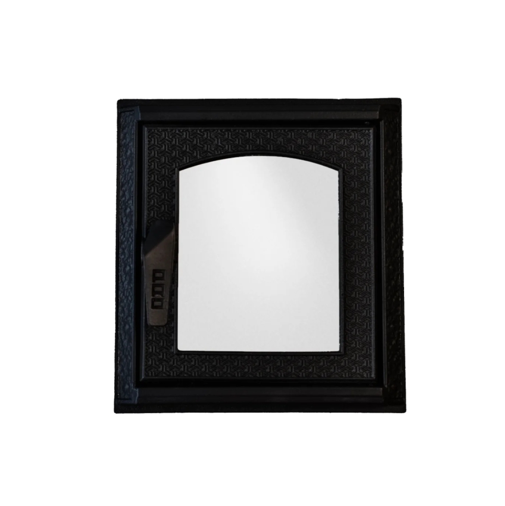 Дверца печная - используется для подкладывания дров в печь, панорамное стекло позволяет любоваться процессом горения. Выполнена методом чугунного литья, оснащена удобной в использовании ручкой и стильным орнаментом, позволяющим сделать очаг прекрасным предметом интерьера.
