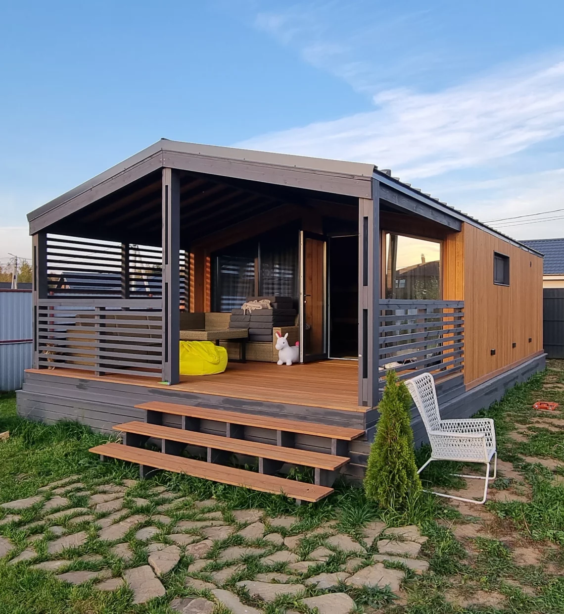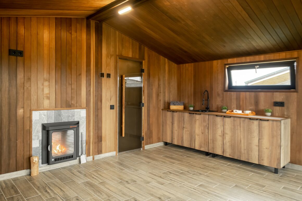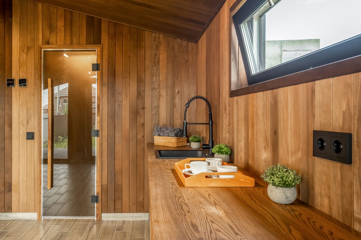 Готовый банный модуль, продуманный до мелочей, с внешней и внутренней отделкой и всем необходимым оборудованием для русской бани.