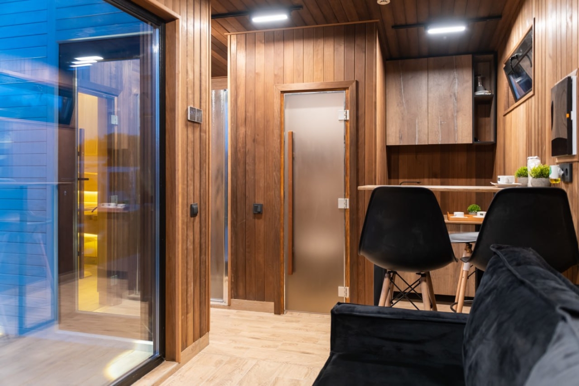 Модульная Г-образная баня BoxBe Cozy House без стройки на участке
