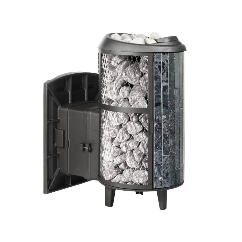 Модель с комбинированной облицовкой из нержавеющей сетки и ламелей. Особенность модели - открывающаяся дверь с ламелями. Это оригинальное решение обеспечивает быстрый прогрев парной.