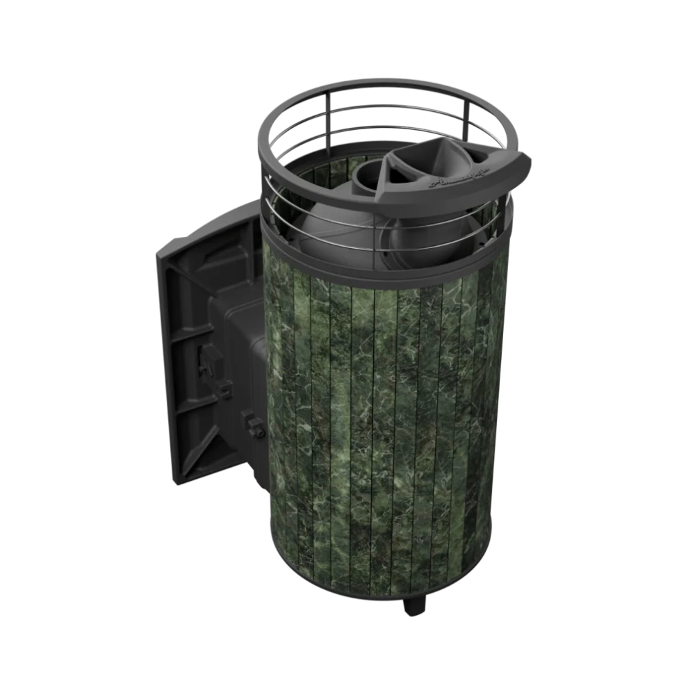 Компактная и экономичная модель. Кожух печи изготовлен в виде сетки из стали и полностью заполняется природными камнями, обеспечивая высокую динамику нагрева парильного помещения.